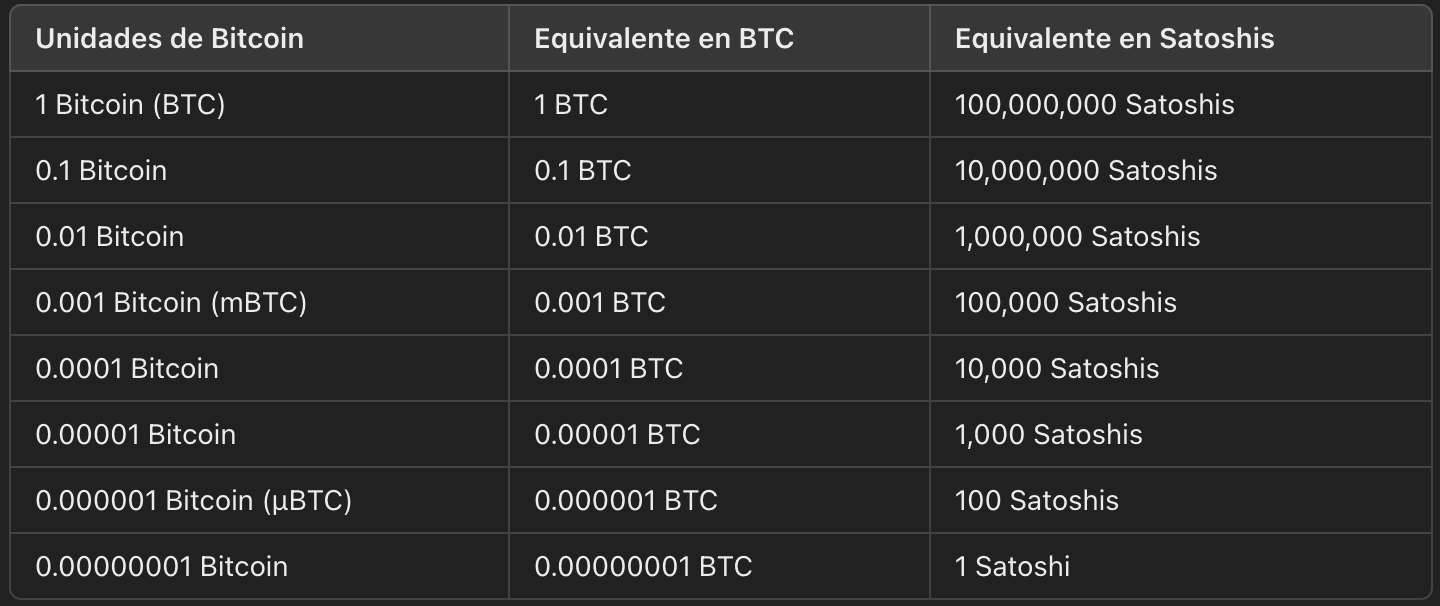 La división en unidades más pequeñas permite realizar transacciones de menor valor, lo que es útil dado el precio elevado que a menudo tiene un Bitcoin. Estas divisiones se organizan de la siguiente forma: